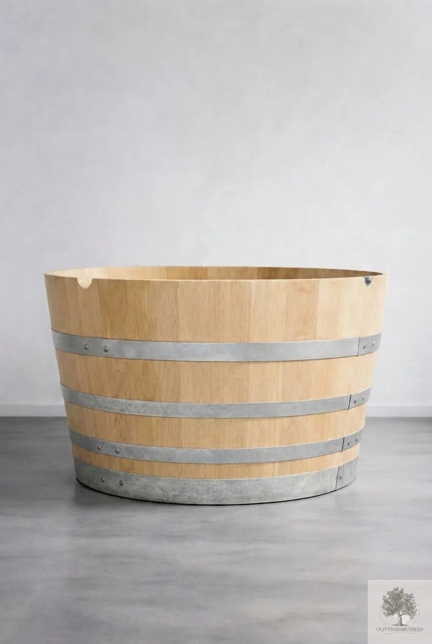 Den generösa planteringsvolymen gör att rötterna får utrymme att utvecklas naturligt. Ett utmärkt val för dig som söker en halv vintunna för olivträd eller en rustik träkruka till större växter.